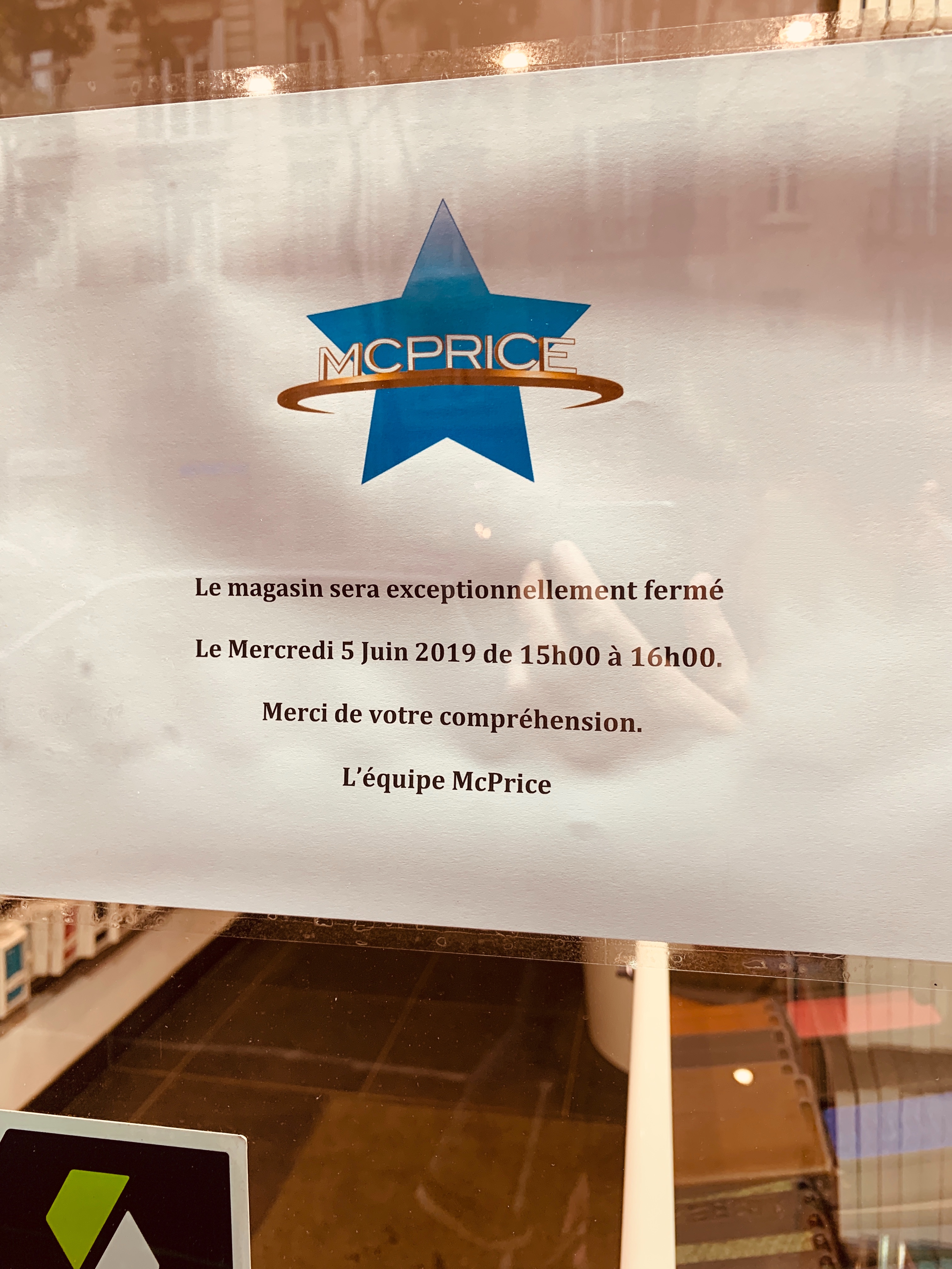 Posté le 11/01/2017 à 10:48"L'équipe de Mc price est super professionnelle, sympa et à l'écoute de ses client-e-s. On vous conseille pour trouver ce dont vous avez vraiment besoin. Réparations rapides, et j'ai trouvé exactement ce que je voulais et ce que je cherchais. Tout cela avec un sourire et compréhension de l'équipe; merci encore et à bientôt."
